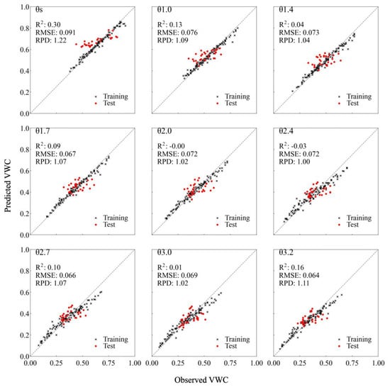 Figure 4 presents the predicted volumetric water content at a given matric suction i (θi) by EBM. The expected R2 was 0.157 based on the sample size in this study [30]. The model outperformed the expected R2 at θs (i.e., saturation conditions), performed comparably at θ1.0 and θ3.2, and underperformed at other θi. The best model performance was obtained at θs (R2 = 0.30, RPD = 1.22). This indicates that the hypothesis (i.e., the saturated water content of forest soils can be predicted from vis-NIR spectra) is likely valid under the conditions tested. In other words, despite the very limited sample size used in this study, the fact that the R2 exceeded the theoretically expected maximum of only 0.157 by nearly a factor of two provides indicative support for the plausibility of the hypothesis. The worst model performance was observed at θ2.0 and θ2.4 based on the negative R2 values. The model performances at θ1.4 and θ3.0 were inadequate because the R2 values were lower than the expected R2. The mean RPD (1.07 ± 0.07) was similar even though R2 was between −0.03 and 0.30. The RMSE between θ1.4 and θ3.0 was approximately 0.07, which is within approximately 15% of the predicted values, despite the inadequate model performance. The model performance tended to decrease toward θ3.0 but improved again at θ3.2, which indicates that the prediction accuracy improved at matric suctions higher than pF 3.2 (e.g., pF 4.2). Many previous studies [20,21] have found that the prediction accuracy of their models improved when applied to predicting the volumetric water content in dry regions rather than in wet regions. Blaschek et al. were able to predict the volumetric water content at the permanent wilting point (pF 4.2 = −1500 kPa) more accurately than at the field capacity (pF1.0 = −0.98 kPa) [20].