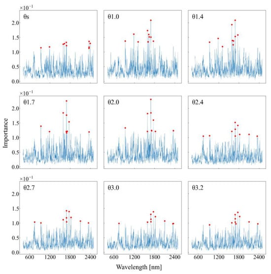 Importance of each wavelength for predicting the volumetric water content (θ) at a given matric suction (pF i). Red dots represent the ten most important wavelengths for each θi.