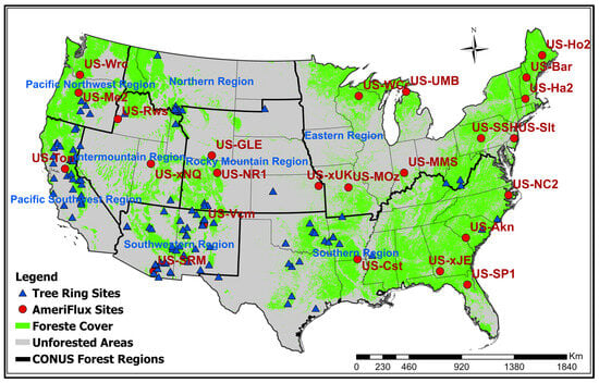 Study area: Forest cover for the contiguous United States (light green) produced by the U.S. Forest Service []. The red circle indicates 24 AmeriFlux sites, while the 135 blue-black triangles represent the tree-ring sites used to evaluate the ForDRI in this study.