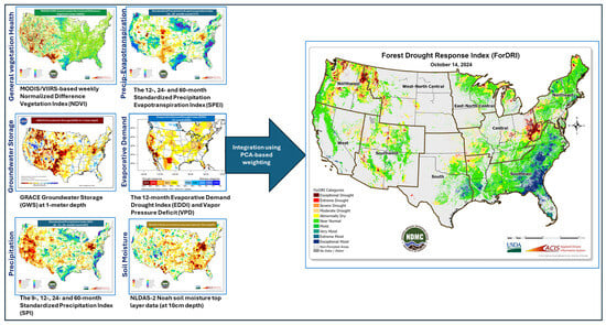 For the weekly ForDRI model, the PCA-nearest neighborhood method was used to determine the weight of each input variable at each grid cell for each week in the year, which reflects their relative (potential) contribution to forest drought conditions, as detailed in Tadesse et al. []. After determining the weight for the suite of input variables using the PCA-nearest neighborhood method, the weekly ForDRI values for each grid cell were calculated across the CONUS forest areas. The final ForDRI values are computed by first multiplying the input variables by their respective weights, which are determined through the PCA-nearest neighborhood method. Then, adding all weighted inputs together and standardizing the values at each grid using the z-score. The ForDRI maps are created based on these grid values in the forested areas. Figure 3 illustrates the steps from data processing to generating the ForDRI values and maps.