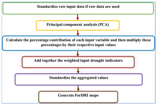 The general flow of the methodology to combine input variables using their contribution/weight using principal component analysis (PCA)’s nearest neighborhood method to generate ForDRI values/maps.