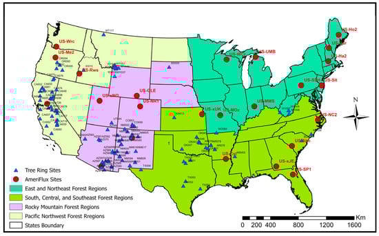 Four forest groups clustered for the CONUS based on their geographic locations to evaluate the ForDRI: (i) the West and Pacific Northwest Forest regions, (ii) the Rocky Mountain and Southwest Forest regions, (iii) the East and Northeast Forest regions, and (iv) the South, Central, and Southeast Forest regions. The AmeriFlux sites in red circles and tree-ring sites in blue-black triangles are also shown.