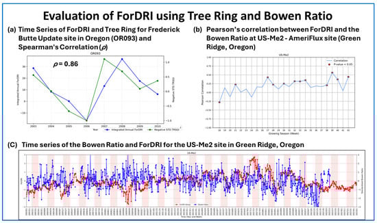 Comparison of the historical records of ForDRI-TRSGI (ForDRI and Tree Ring Standardized Growth Index) and ForDRI-BR (ForDRI and Bowen Ratio): (a) Time series of ForDRI and TRSGI for Frederick Butte Update site (OR093) and FORDRI-TRSGI Spearman’s Correlation (ρ), (b) Pearson’s correlation between ForDRI and the BR at US-Me2-AmeriFlux site (Green Ridge, Oregon), and (c) Time series of the BR and ForDRI at the US-Me2 site.