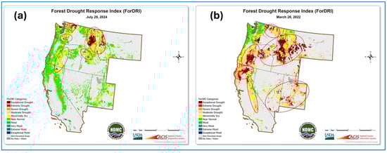 West and Pacific Northwest Forest regions Evaluation: examples of case study maps of Forest Drought Response Index (ForDRI) for (a) 29 July 2024, and (b) 28 March 2022. The red ovals on the maps indicate the specific drought signals considered during the evaluation.