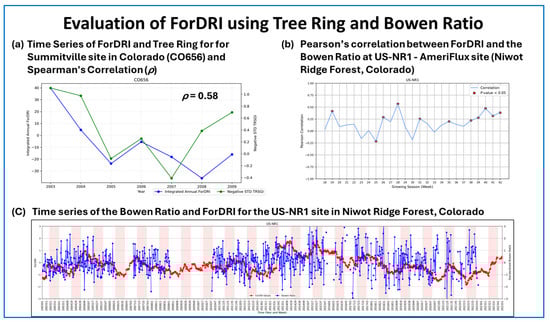 Evaluation of the historical records of ForDRI-TRSGI and ForDRI-BR: (a) Time series of ForDRI and FORDRI-TRSGI Spearman’s Correlation for the Summitville site in Colorado (CO656), (b) Pearson’s correlation between ForDRI and the Bowen Ratio at US-NR1-AmeriFlux site (Niwot Ridge Forest, Colorado), and (c) Time series of the Bowen Ratio and ForDRI for the US-NR1 site.