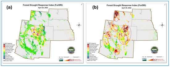 Rocky Mountain and Southwest Forest Region Evaluation: examples of case study maps of Forest Drought Response Index (ForDRI) for (a) 29 April 2024 and (b) 25 April 2022. The red ovals on the maps show the specific drought signals to be considered during the evaluation.