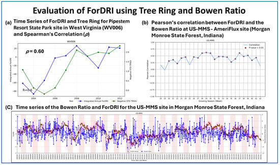 Comparison of the historical records of ForDRI-TRSGI and ForDRI-BR: (a) Time series of ForDRI and TRSGI with FORDRI-TRSGI Spearman’s Correlation for Pipestem Resort State Park site in West Virginia (WV006), (b) Pearson’s correlation between ForDRI and the Bowen Ratio at US-MMS-AmeriFlux site (Morgan Monroe State Forest, Indiana), and (c) Time series of the Bowen Ratio and ForDRI for the US-MMS site.