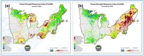East and Northeast Forest Regions Evaluation: examples of case study maps of Forest Drought Response Index (ForDRI) for (a) 8 January 2024 and (b) 15 August 2016. The red ovals on the maps show the specific drought signals to be considered during the evaluation.