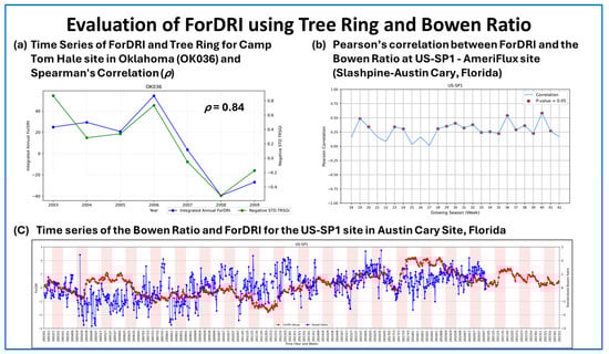 Comparison of the historical records of ForDRI-TRSGI and ForDRI-BR: (a) Time series of ForDRI and TRSGI with FORDRI-TRSGI Spearman’s Correlation for Camp Tom Hale site in Oklahoma (OK036), (b) Pearson’s correlation between ForDRI and the Bowen Ratio at US-SP1-AmeriFlux site (Austin Cary Site, Florida), and (c) Time series of the Bowen Ratio and ForDRI for the US-SP1 site.