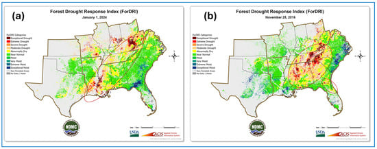 South, Central, and Southeast Forest Regions Evaluation: examples of case study maps of Forest Drought Response Index (ForDRI) for (a) 1 January 2024 and (b) 28 November 2016. The red ovals on the maps show the specific drought signals to be considered during the evaluation.