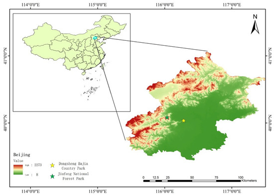 The open-source forest point cloud dataset, TreeLearn, employed in this study comprises 19 tree plot-level point clouds sourced from Germany. For further details regarding this dataset, readers are referred to the pertinent original study [19]. Additionally, Dongsheng Bajia Country Park and Jiufeng National Forest Park, located in the Haidian District of Beijing, China, were designated as the study areas for this research. The geographic coordinates of Dongsheng Bajia Country Park are delineated between 116.2815° and 116.2958° E and 39.9712° and 39.9795° N. The elevation within the park varies between 40 m and 60 m. The predominant tree species within the park comprise poplar, willow, locust, and pine trees, collectively representing a typical urban plantation forest ecosystem. The geographic coordinates of Jiufeng National Forest Park extend from 116.1134° to 116.1419° E longitude and from 39.9971° to 40.0216° N latitude. This region is characterized by a complex topography and considerable elevation variation, ranging from 100 m to 1153 m above sea level. The predominant tree species in this park include greasy pine, larch, ginkgo, and oak forests, collectively illustrating a typical nature reserve in North China. The data collection period for this study spanned March and August 2024, during which the weather conditions were predominantly sunny and aligned with the spring season, contributing to a relatively stable climate that facilitated the accurate acquisition of image data pertaining to the forest landscape (Figure 1).