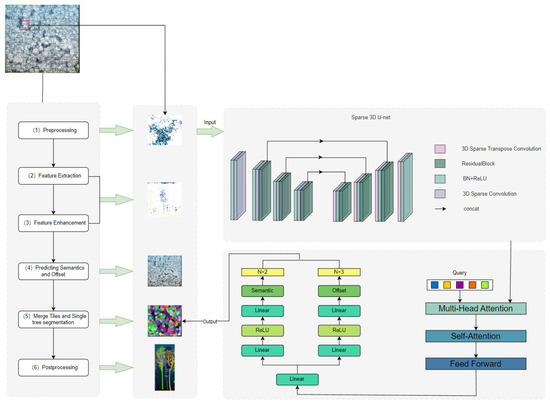 This study proposes a deep learning-based model for single-tree segmentation, comprising three distinct modules: a Sparse 3D U-Net, an attention layer, and a prediction head, utilizing forest point cloud data as input [28]. Each of the three modules performs a unique function and collaboratively operates to achieve single-tree segmentation. Initially, the Sparse 3D U-Net is employed to extract bottom-up, point-by-point features from the point cloud data. Subsequently, the attention layer incorporates a multi-head attention mechanism, a self-attention mechanism, a feedforward neural network, and a learnable query vector to augment the model’s global perceptual and semantic parsing capabilities. Ultimately, two independent Multi-Layer Perceptron (MLP) networks are utilized within the prediction head section to forecast both semantic information and offset information, respectively.