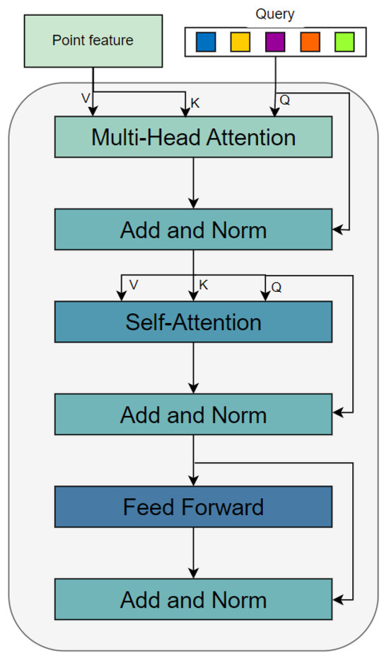 where and represent the learnable weights, while and denote the learnable bias vectors. The feedforward neural network (FFN) further amplifies the expressive capacity of the model and integrates residual connections along with normalization operations subsequent to each layer. The module takes as input point-by-point features and learnable query vectors such that each query vector corresponds to a potential instance prediction based on point-by-point features. Moreover, the query vectors progressively learn the feature templates and distributions of diverse instances within the space via the multi-layer attention mechanism. The specific architecture is illustrated in Figure 3.