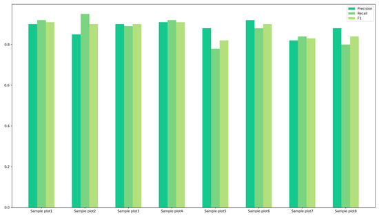 Figure 5 illustrates the comparative results of various sample segmentation metrics. Given the complexity inherent in sample segmentation, we evaluated the performance of three metrics—precision, recall, and F1 score—across the different samples. Through the evaluation and analysis of the generated segmentation results, we present the comparative outcomes of these metrics across eight samples, as depicted in Figure 5. Specifically, owing to the minimal differences between trees within the sample plots, sample 2 demonstrates the highest recall, suggesting that the model is capable of recognizing the majority of actual positive samples in this instance. Conversely, owing to the significant differences between trees in the sample plots, sample plot 5 exhibits a relatively low recall, implying that the model may have overlooked some actual positive samples in this particular plot. This phenomenon may be attributed to the highly consistent morphological, textural, and spectral characteristics of the tree crowns in sample 2, which led to a reduced inter-class distance within the feature space of the model, thereby facilitating identification via clustering algorithms or threshold-based segmentation. Sample 5 likely comprises trees at various developmental stages, with overlapping canopies and shading effects leading to feature fragmentation, thereby posing challenges for the model in accurately distinguishing neighboring instances. Additionally, due to insufficient terrain leveling in sample plots 7 and 8, these plots also exhibit relatively low recall. Moreover, the accuracy and F1 scores exhibit a similar trend. Overall, our model demonstrates commendable performance across several sample plots.