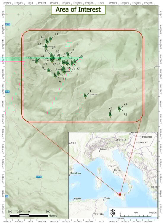Arcidiaco, L.; Corongiu, M.; Della Rocca, G.; Barberini, S.; Emiliani, G.; Schicchi, R.; Bonomo, P.; Pellegrini, D.; Danti, R. Health Monitoring of Abies nebrodensis Combining UAV Remote Sensing Data, Climatological and Weather Observations, and Phytosanitary Inspections. Forests 2025, 16, 1200. https://doi.org/10.3390/f16071200