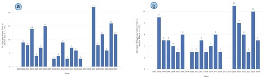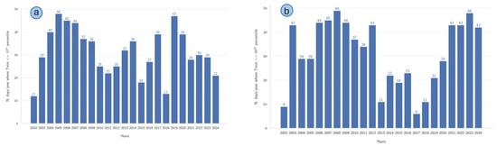 - Settanta, G.; Fraschetti, P.; Lena, F.; Perconti, W.; Piervitali, E. Recent Tendencies of Extreme Heat Events in Italy. Theor. Appl. Climatol. 2024, 155, 7335–7348. [Google Scholar] [CrossRef]