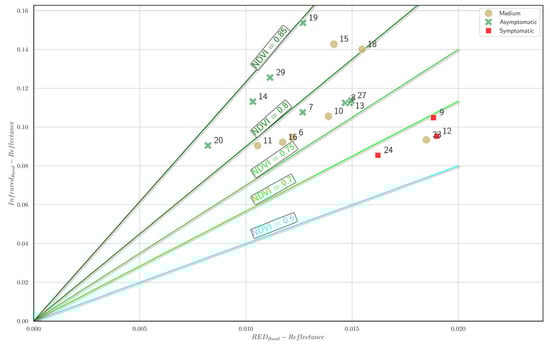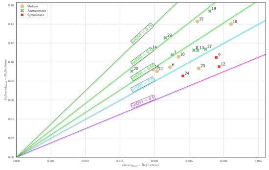 | Green NDVI | Uses green reflectance instead of red, often more sensitive to chlorophyll content. | −1 to +1 | [31] | |
