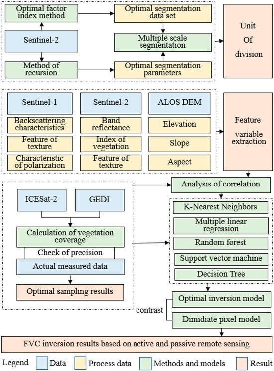 This study combines active and passive multi-source remote sensing data to conduct inversion research on vegetation coverage. Firstly, based on actual measurement data, the vegetation coverage sampling capabilities of active ICESat-2 and GEDI spaceborne LiDAR were explored, and satellite ground collaborative vegetation coverage sampling was conducted. Secondly, effective remote sensing estimation factors for different vegetation types from multi-source data such as passive optical remote sensing Sentinel-2, active microwave remote sensing Sentinel-1, and DEM were explored. The objectives of this study are as follows: (1) Determine the optimal segmentation inversion unit for ground FVC estimation and determine the parameter values set for each factor. (2) Extract feature variable datasets from various remote sensing sources for different ground FVC inversion purposes and identify the key feature variables. (3) Compare FVC estimation models employing different algorithms and select the most effective inversion model.