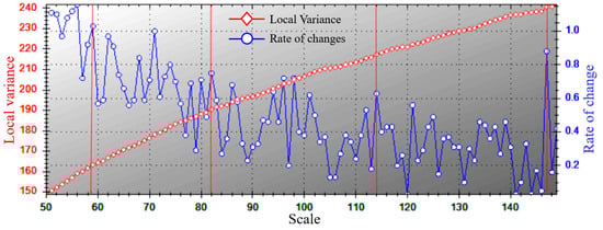 In the three variables of shape, compactness, and segmentation scale, the two variables were controlled to be unchanged, and the step increment experiment was performed on one variable to determine the optimal value, the initial value of shape factor and compactness was set to 0.1, and the test was carried out with step 0.1 increments to determine the shape factor and compactness of 0.1 and 0.5, respectively. The starting value of the segmentation scale parameter was set to 10, and the step size was increased to 200 for experimentation, and the ROC-LV curve was obtained, and it was found that there were obvious “oversegmentation” and “undersegmentation” phenomena when the step size was less than 50 and greater than 150. The red line in the figure corresponds to the mutation points of local variance between 50 and 150, which can be regarded as potential optimal scale parameters. The segmentation scale is set in steps of 25, divided into four levels: 50–75, 75–100, 100–125, and 125–150, and a mutation point (59, 82, 114, 147) is selected as the optimal segmentation parameter in each level. The accuracy was verified with the field sample data, and the scale, shape, and compactness were finally selected as the best segmentation values of 82, 0.1, and 0.5, respectively, with an accuracy of 87.67% (Figure 2 and Table 4).