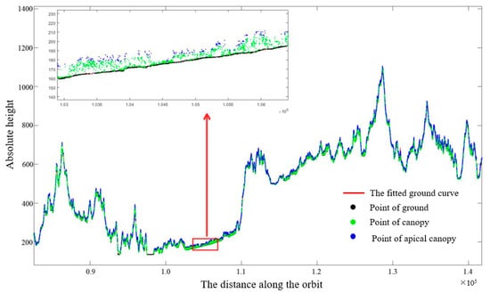 Figure 3 shows the ground interpolation fitting curve and the distribution of the point cloud. Compared with the weak beam, more understory ground photon points can be obtained under the strong beam, and the ground terrain accuracy of interpolation fitting is higher. Therefore, in this study, only ground interpolation fitting of strong beam orbital data was performed to obtain continuous ground surface, and the ground interpolation fitting accuracy was high, and the coefficient of determination R2 was above 0.95, which met the requirements.