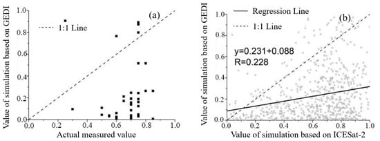 The accuracy analysis and verification of vegetation coverage extracted by GEDI were randomly used to analyze and verify the vegetation coverage extracted by GEDI, and the results showed that there was no correlation between the two, and the GEDI vegetation coverage in most of the samples was underestimated. The GEDI vegetation coverage was analyzed by using the sample square points collected by ICESat-2, which had a high correlation with the measured vegetation coverage. There are 684 identical sampling units between ICESat-2 and GEDI in the study area, and it can be seen the vegetation coverage extracted by GEDI has a positive correlation with that of ICESat-2, and the correlation is low; the size is 0.228, and the vegetation coverage of GEDI is significantly lower than that extracted from ICESat-2 (Figure 4).