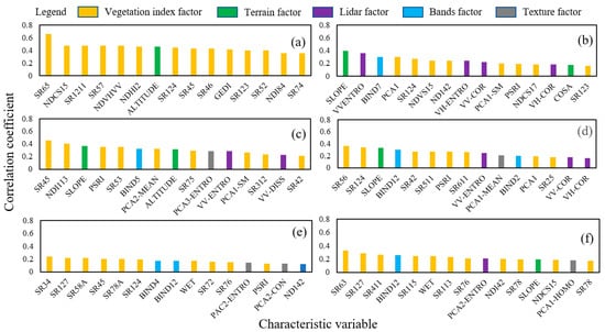 Optimization results of features variables under different vegetation types. (a) Wetland, (b) Cropland, (c) Shrubland, (d) Grassland, (e) Broadleaved forest, and (f) Others.