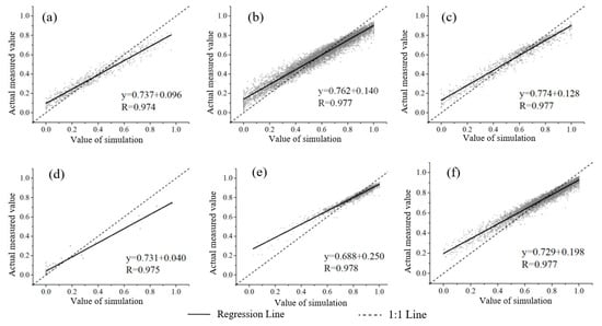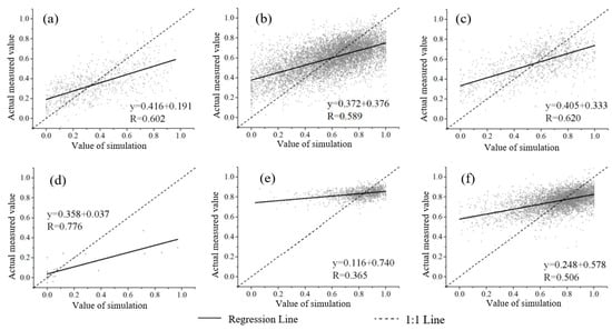 Scatter diagram of FVC estimated by SVM. (a) Cropland, (b) Grassland, (c) Shrubland, (d) Wetland, (e) Broad-leaved forests, and (f) Others.