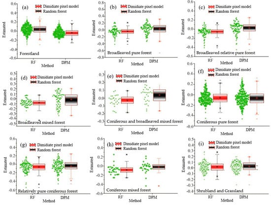 Vegetation coverage error graphs of the conventional model (DPM) and the most advanced machine learning model (RDF). (a) All data, (b) Pure broadleaved forest, (c) Broadleaved relatively pure forest, (d) Mixed broadleaved forest, (e) Mixed coniferous broadleaved forest, (f) Pure coniferous forest, (g) Relatively coniferous forest, (h) CMF: Coniferous mixed forest and (i) Shrubland and grassland.