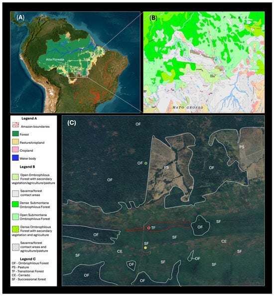 (A) Location of the study area in the Southern Amazon within the municipality of Alta Floresta, Mato Grosso, Brazil, highlighting the main land use classes. (B) Regional view of the study area showing the main vegetation types based on the IBGE Vegetation Classification Map (2004) available at: https://www.ibge.gov.br/geociencias/informacoes-ambientais/estudos-ambientais/ (accessed on 25 October 2024). (C) Distribution of vegetation types in the study area: green dot indicates open ombrophilous forest, red dot indicates transitional forest, and yellow dot indicates successional forest.