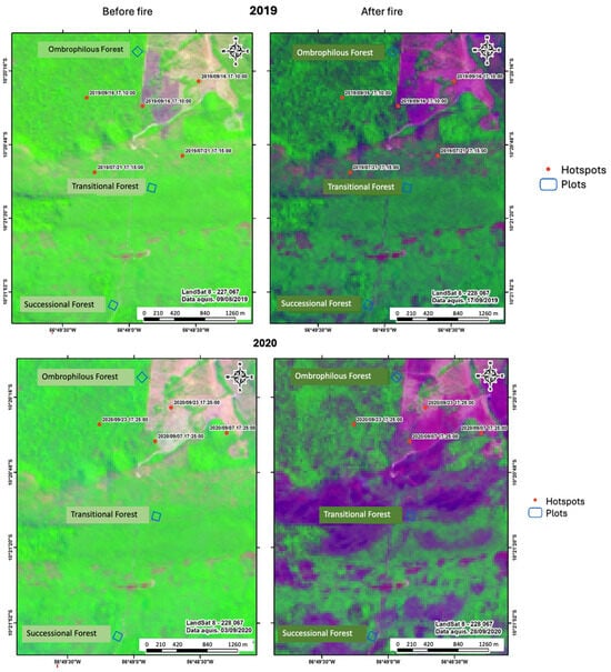 Unlike the Cerrado vegetation of central South America—a savanna biome adapted to frequent fires—its neighboring Southern Amazonian forests, such as open ombrophilous forest (OF) [11] and ecotonal forest types like successional forests (SF) (sensu [12,13]) and transitional successional forests (sensu [11]), are neither fire-resistant nor fire-resilient, especially when exposed to repeated fires over short intervals. Although the Amazon did not experience the same extreme drought conditions in 2019 as in 2016, the widespread fires that year drew international attention [14]. These fires were facilitated by weakened post-El Niño forest resilience and legislative weaknesses (e.g., Brazilian New Forest Code—Law n° 12.651), which encouraged illegal burning to clear new areas for pasture [15,16].