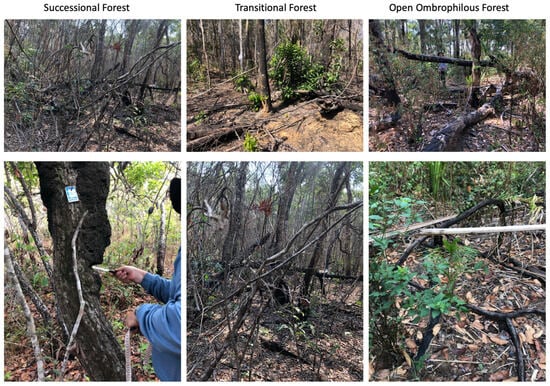 The identification of different phytophysiognomies was based on initial inventory data and biogeographical references from the RADAMBRASIL Project [11] as well as previous studies on the Amazon–Cerrado transition [12,13,37,38,39,40]. The study areas consisted of 1-hectare forest plots, each divided into twenty-five 400 m2 subplots, designed to represent the local vegetation, including areas affected by fire. Due to increasing aboveground biomass from SF to TF and OF following a topographic catena (sensu [40]), we considered the vegetation types as forming a gradient with OF in the bottom, TF in the slope, and SF in the top of a hillslope.