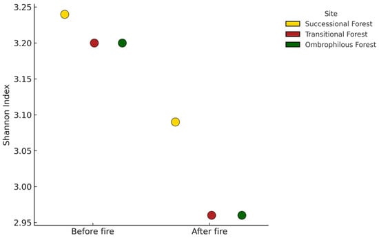 Floristic diversity (Shannon index) of successional forest, transitional forest, and open ombrophilous forest sampled in Southern Amazonia (Alta Floresta, MT) before and after the second fire.