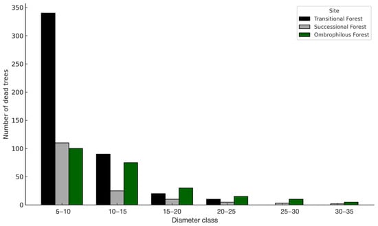 Between the surveyed years, 139 individuals died, with 76.4% of the mortality occurring in the first diameter class (5–10 cm) (Figure 5). The species contributing most to mortality within this diameter class were Guatteria discolor (11 individuals), Dacryodes microcarpa (6), and Humiria balsamifera (5).