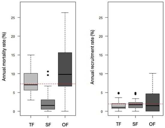 Similarly, the TF recorded the second-highest net post-fire biomass loss, although its post-fire impact was lower than that of the OF. The TF exhibited the lowest net biomass loss when comparing the balance between recruitment and mortality, differing only slightly from what is typically observed for this vegetation type under normal conditions [61,62]. On the other hand, the TF showed a high post-fire mortality rate (28%), slightly lower than that of the OF (29.8%), and both were considerably higher than that observed in the SF vegetation (9.1%) (Figure 7). These findings reveal, concerning fire, the significant vulnerability of the two forest types studied and the resilience of the SF (Figure S7).