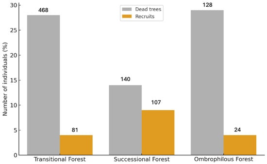 The number of living individuals decreased from 1672 in 2017 to 1285 in 2021 (Table 1), a net loss of 387 individuals. This decline was also reflected in the total community basal area, which decreased from 14.5 m2 in 2017 to 12.2 m2 in 2021, corresponding to a net basal area loss of 15.8% (mortality minus recruitment) over the four-year period. The average annual mortality rate was 7.9% of individuals per hectare per year, resulting in a cumulative tree mortality of 28.0% in the transitional forest (TF) from the first to the second inventory (Figure 5 and Figure 6).