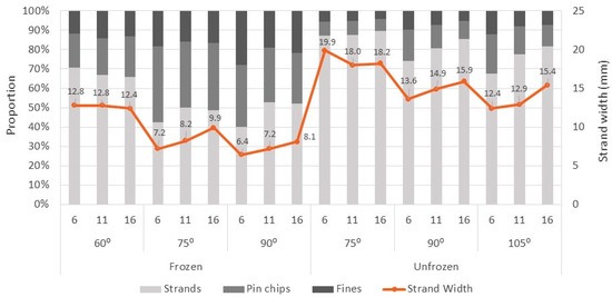 Particle distribution and average strand width for frozen and unfrozen logs processed with various counter-knife angles and counter-knife and knife edge distances. The authors generated the graph based on data from Alipraja et al. [7].