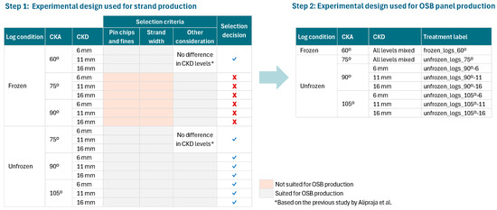 Experimental design used for strand production, including the criteria for selecting treatments and the final experimental design used for OSB panel manufacturing [7].