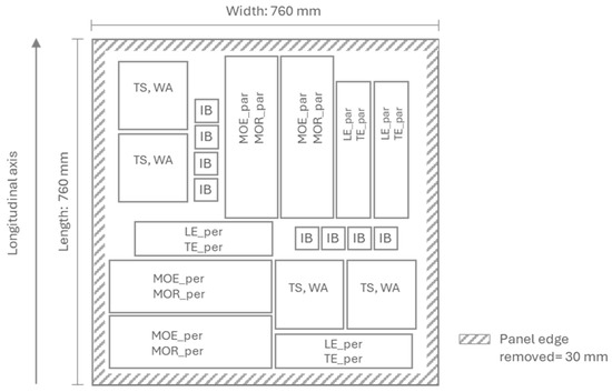 Specimen cutting template for mechanical and physical tests of OSB panels. TS, WA: thickness swelling and water absorption. IB: internal bond strength. MOE_par, MOR_par, MOE_per, MOR_per: modulus of elasticity and modulus of rupture in parallel and perpendicular bending, respectively. LE_par, TE_par, LE_per, TE_per: linear expansion and thickness expansion in parallel and perpendicular directions, respectively.