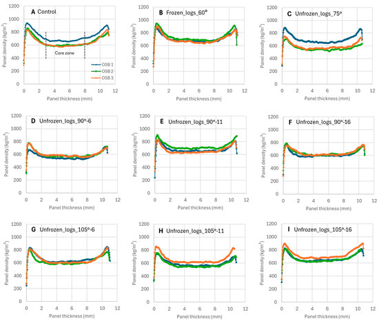 The vertical density profiles of the OSB panels for the three panels produced from each treatment are illustrated in Figure 5. Each density profile represents the average of eight measurements taken for each panel. All OSB panels exhibited a typical U-shaped density profile. The surface densities in the panels are typically correlated with bending properties, while core density is associated with IB strength and thickness swelling. Density profiles that display a pronounced U-shape typically enhance bending properties, whereas flatter profiles improve IB strength. For OSB, a flatter density profile with minimal variation between the surface and core layers is preferred as it helps to mitigate thickness swelling by resulting in lower interlayer shear forces, lower springback, and, therefore, reduced swelling [20].