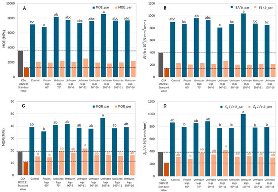 Bending properties of OSB panels made with jack pine strands produced from frozen and unfrozen logs using a strander-canter with various cutting parameters. (A) Modulus of elasticity. (B) Bending stiffness per mm specimen width. (C) Modulus of rupture (D) Maximum bending moment per mm specimen width. The CSA O325:21 reference values are shown in dark grey and dark orange for measurements taken in the parallel and perpendicular directions, respectively. The dashed lines indicate the minimum values permitted. Means with the same letter are not statistically different by Tukey’s test.