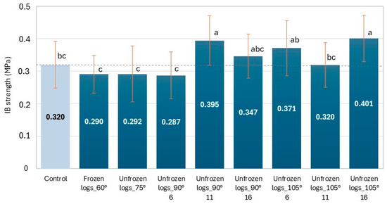 Internal bond (IB) strength of OSB panels made with jack pine strands produced from frozen and unfrozen logs using a strander-canter with various cutting parameters. The control is shown in light blue for visual comparison. Means with the same letter are not statistically different by Tukey’s test.