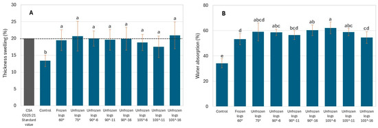 (A) Thickness swelling and (B) water absorption after 24 h water soaking of OSB panels made with jack pine strands produced from frozen and unfrozen logs using a strander-canter with various cutting parameters. The CSA O325:21 standard reference is shown in dark grey. The dashed line indicates the maximum thickness swelling allowed by the standard. Means with the same letter are not statistically different by Tukey’s test.