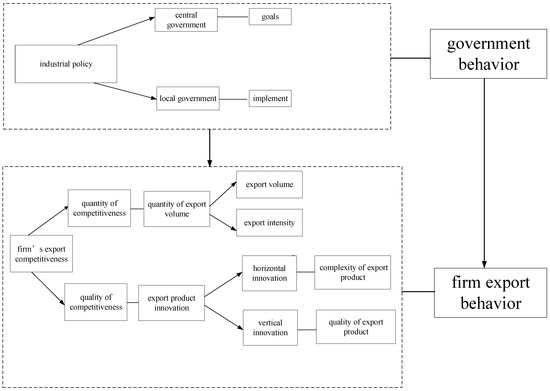 Competitiveness became a key part of regional and national industrial policy in the 1990s. Competitiveness refers to the degree of advantage a country, region, enterprise or product has over its competitors in the international market or a specific market and is an indicator of its ability to successfully compete [49]. At the national level, competitiveness may include macroeconomic stability, infrastructure construction, education level, technological innovation, and other aspects; at the enterprise level, competitiveness may involve product quality, brand image, marketing strategy, cost control, and other aspects. In the field of strategic management, Professor Michael Porter answered this question from a new perspective and proposed a concept corresponding to comparative advantage, namely competitive advantage [50]. Porter believes that the productivity of a country ultimately depends on the production capacity of its enterprises, and that competition between countries is actually between enterprises; a country cannot have international competitive advantages in all industries, but rather concentrates on a few limited industries, and industries should be the basic unit for studying national competitive advantages; the source of international competitive advantages of industries is not only the “factor conditions” in trade theory, but the formation of the “diamond system” on which industrial development depends—the interrelationship of factor conditions, demand conditions, competitive background of corporate strategy and structure, related supporting industries, opportunities, and government [51]. At the micro level, Melitz (2003) [50] introduced firm-level heterogeneity into a model of trade by adapting a Ricardian model to firm-specific comparative advantage. Firm export competitiveness refers to the ability of enterprises to obtain the best market share and profit in foreign markets with lower costs (cost strategy) and differentiated products (product innovation). In the international environment, firms have higher export performance and excess profits than other competitors under scarce resources (i.e., competition and non-monopoly conditions). Competitiveness of enterprises in the context of globalization is actually the international competitiveness of enterprises [52]. Figure 2 illustrates the conceptual model that guides this study. Government industrial policies influence firm-level export competitiveness through two primary channels—quantity and quality. These effects are mediated by firm heterogeneity and shaped by the broader institutional and market environment.