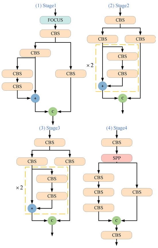 In this design, the backbone network draws on the idea of four layer feature extraction in YOLOX [22]: on the CNN branch, a simplified version of CSPParkNet consisting of four stages has been constructed (as shown in Figure 2, indicates that the module is repeated twice), and its internal module structure is shown in Figure 3. Compared with the original CSPParkNet, we reduced the number of cycles in the second and third stages, respectively, so as to maintain excellent feature extraction efficiency while significantly reducing the number of parameters.