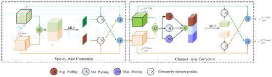 In the dual-branch backbone network, CNN branch and Transformer branch are good at capturing local texture and global context, respectively, but they often have deviations in feature distribution and response scale, which hinder information complementation and even cause conflicts. To solve this problem, we designed a feature correction module, which consists of two stages: “spatial correction” and “channel correction”. The spatial correction stage relies on local spatial correlation and implements dynamic-weighted offset for CNN features and Transformer features to compensate for their differences in local response. In the channel correction phase, based on the global semantic relevance, the features that have completed spatial correction are weighted and fused again on the channel dimension, so as to align the overall distribution of the two branches. Figure 4 shows the overall architecture of the module. The following is the detailed process of the two sub modules.