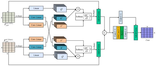 The down-sampled feature sequences and are used to calculate the two-way multi-header cross-attention. Specifically, FFM calculates the interaction between the two branches on each attention head. The formula is as follows: