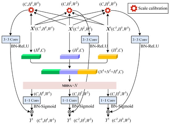 In order to capture the size and shape changes in fire targets more comprehensively, multi-scale features are directly incorporated into the self attention calculation process. The MSFAU receives the characteristic output from the last three stages of the dual-branch backbone network, which is recorded as . To unify the number of channels, we first apply a convolution to each of the three features, and transform the channel dimension into the same C. Then, we map the two-dimensional image features into a one-dimensional token sequence through the reshaping operation, which is expressed as , where . Then, , and are spliced on the spatial dimension and sent to the continuous N-layer MHSA to fully interact with the spatial association between tokens of different scales. Thanks to the strong ability of multi-head self attention to describe long-distance dependence, all pixel relationships inside and outside the scale are included in the calculation of attention weight uniformly. However, multiple MHSA calculations will change the distribution of the original features, which may adversely affect the detection accuracy. For this reason, MSFAU introduced an attention weighting mechanism: first, split the MHSA output into spatial dimensions, and reshape it back to the two-dimensional feature map; then the attention weight is generated by convolution, batch normalization (BN) and sigmoid activation respectively. In addition, in order to fuse multi-scale information more fully, the module also adds scale calibration operation: for the three calibrated features, average pooling and upsampling are performed first to obtain coarse fusion features under three different resolutions; then, they were activated by convolution, BN and ReLU, respectively, to optimize the characterization ability. Finally, the generated attention weight is multiplied by the corresponding feature graph element by element to output the fine-grained fusion result . The weighting process can be formally expressed as