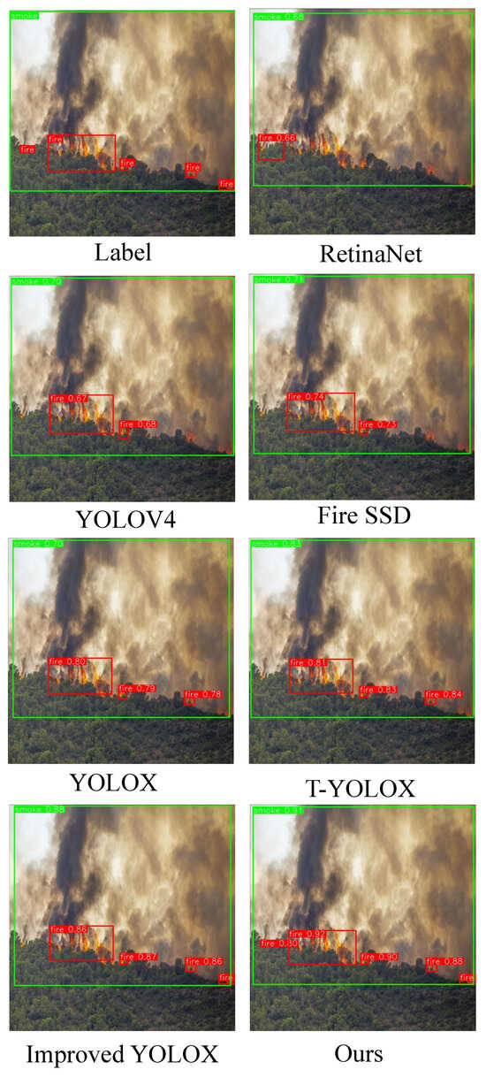 In the comparative experiment in this section, we evaluated the algorithm in this paper with current mainstream single-stage detectors (RetinaNet [27], YOLOv3ṽ5 [28,29], YOLOX, Efficient Det [30], CenterNet [31], etc.) and various models proposed by researchers for forest fire detection scenarios, as well as two Transformer-based models, namely DINO [32] and DETR [33]. The results are listed in Table 3.