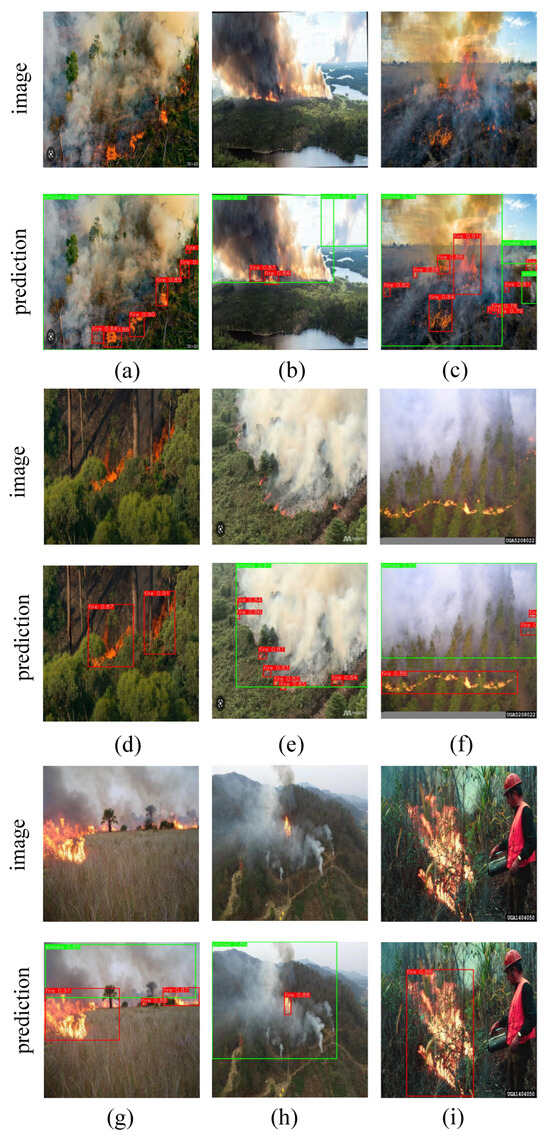 The detection results of the algorithm proposed in this article in complex scenarios. (a) multi-target fire sources and detection results; (d) no smoke occlusion and detection results; (b,c,f) smoke-occluded flames and detection results; (e) small target fire sources under heavy smoke and detection results; (g–i) the several images from the internet and conducted tests and detection results.