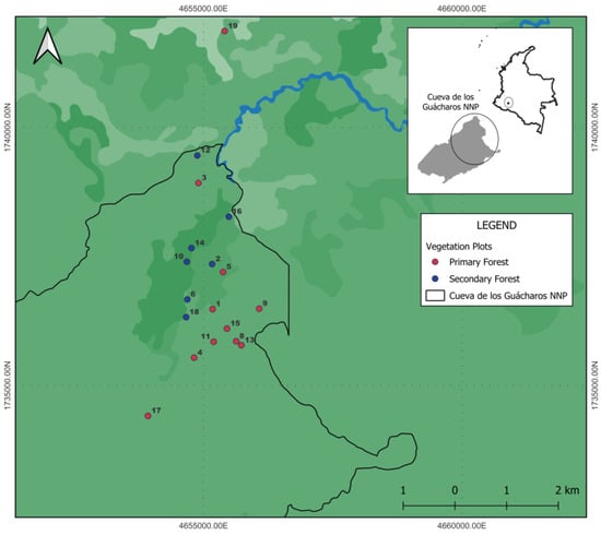 This study was carried out in the Cueva de los Guácharos National Natural Park (CGNNP), located in the Andean region in the southwest of Colombia (Figure 1), in the departments of Huila, Caquetá, and Cauca. It has an area of 7134 ha, an altitudinal range between 1600 and 2840 m asl, a mean annual temperature of 17 °C, a mean annual precipitation of 2000 mm, a long rainy season between February and October, and a dry season from November to January []. The park is classified as a tropical montane forest, and includes Sub-Andean forests, Andean forests, and sub-paramo vegetation of the Eastern Cordillera of the Andes []. In Sub-Andean forests, the canopy reaches heights of 45 m, within which there are stands dominated by black oak (Trigonobalanus excelsa Lozano, Hern. Cam. & Henao), most of which are found in the park’s buffer zones. These stands can represent up to 37% of the total stems [], with an average density of 281 individuals per ha, with basal area values of 52 m2 ha−1 and a volume of 761 m3 ha−1 [].